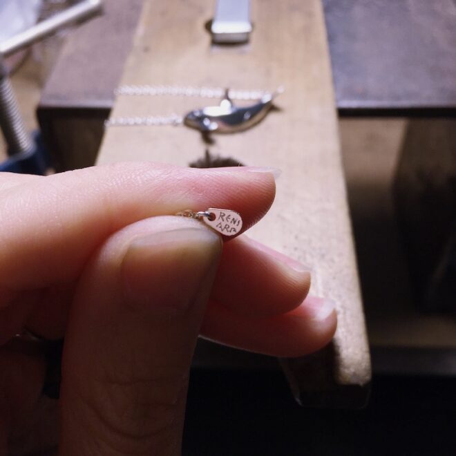 チェーン先端の小さなプレートにもぬかりなく、ロゴを彫りました。