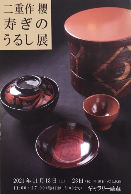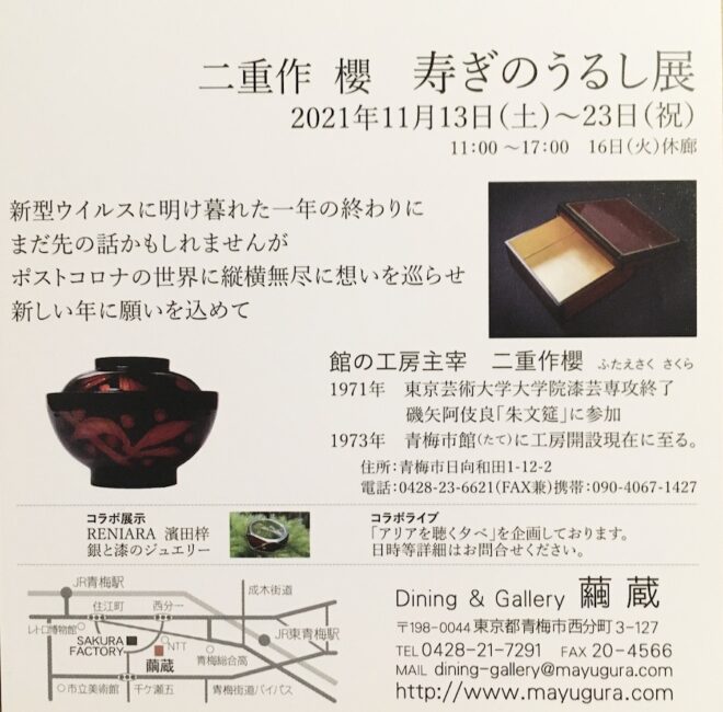 東京都青梅市にある Dining &ギャラリー繭蔵で、母・二重作櫻(ふたえさくさくら)の個展「寿ぎのうるし展」が開催され、そこに私の作品も展示させて頂きます。