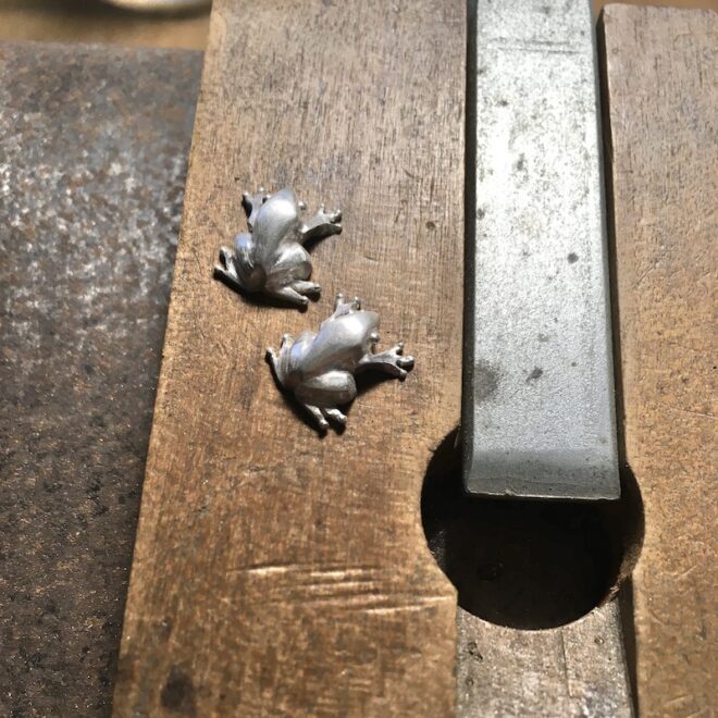 こちらは1cmほどの小さなアマガエルが、耳たぶにピタッとくっついているようなピアスなのですが、2匹のカエルに個性を持たせようと思い、それぞれの背中に違った模様を彫り込んであります。