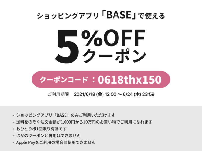 【期間限定】BASEで使える5%OFFクーポンをプレゼント!