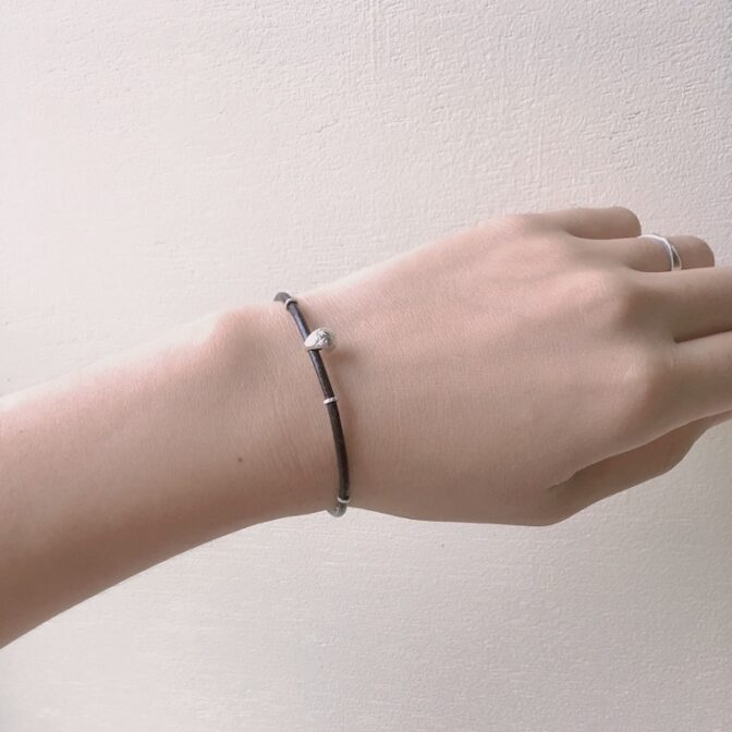 レザーコードの所々に巻き付けたワイヤー(シルバー製)にもテクスチャー(表面加工)をつけ、有機的な雰囲気に拘り仕上げました。
